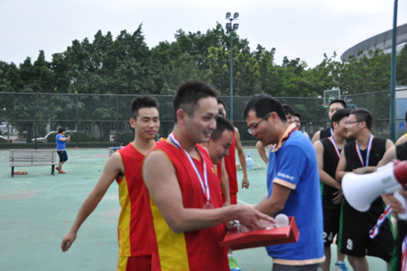 接下來是頒發我們的亞軍獎,獲得本次比賽的亞軍是我們龍華分公司的自由隊,由公司的市場總監韋業成先生為獲獎隊員頒獎。
