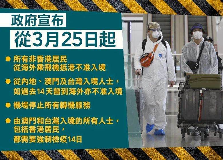 特首林鄭月娥昨宣布,周三(25日)凌晨起,禁止非本港居民入境,也不能取道香港機場過境,只有預先登記的澳門居民例外;同時加強港人回港限制,由臺灣和澳門返港居民,一律不再豁免檢疫,同樣需進行14日強制檢疫;臺灣和澳門非本港居民可入境,但會與內地居民看齊,同樣需進行14日強制檢疫,三地人士若在抵港前14日曾到過外國,則會被拒入境。有關「封關」安排為暫定為期14日。具體措施如下: