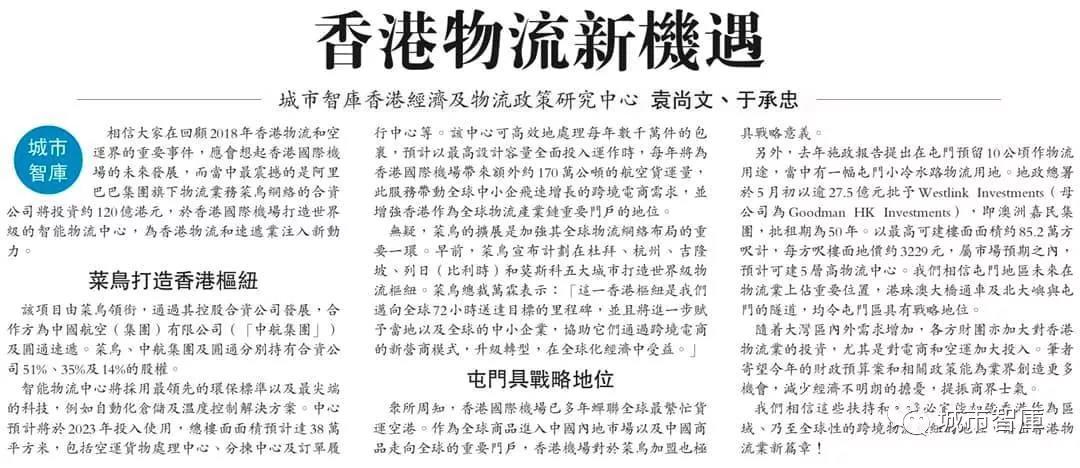 相信大家在回顧2018年香港物流和空運界的重要事件,應會想起香港國際機場的未來發展,而當中最震撼的是阿里巴巴集團旗下物流業務菜鳥網絡的合資公司將投資約120億港元,于香港國際機場打造世界級的智能物流中心,為香港物流和速遞業注入新動力。