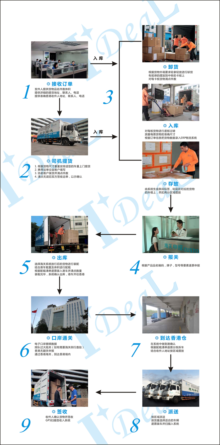 60輛載重0.5-10噸的貨車,提供24小時上門提貨服務,第一時間為客戶提供安全、快捷的上門提貨服務;香港拖車30輛、噸車43輛,保證每天至少8班15噸車或者45尺高柜快件發往香港。能夠保證準時發車,當天到港當天派送。